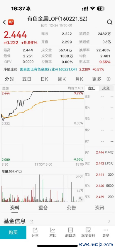 白银基金激励场内LOF狂欢。今天堂投白银LOF连接涨停,溢价照旧高达接近70%,哄骗LOF场内来去价钱与净值的价差进行套利的尺度激励商场祥和。由于该LOF场内价钱相较场外净值有高溢价,故若在T日证券账户内遴荐“场内申购”(非径直买入)按净值申购,投资者可以在T+2日份额到账后,以场内高价卖出,赚取一定差价。高溢价涨停带来资金溢出效应,场内多只商品LOF居品涨停,有色金属LOF(160221)开盘后一都走高并涨停。但也要提醒投资者,套利并不是稳赚不赔,背后也存在一定风险,一定要作念好风险经管,严慎参与。